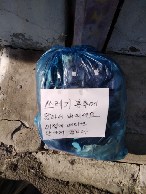 그런데도 일부 주민들은 종량제봉투가 아닌 일반 봉투에 쓰레기 담아서 버리는 경우가 있어서 눈쌀을 찌푸리게 합니다.