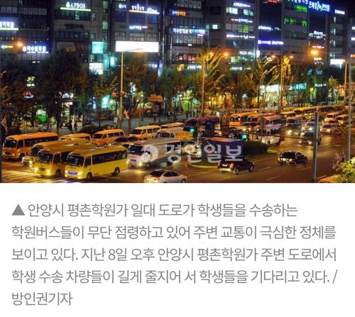 옆 동네 대치동이나 서초동 학원가의 도로는 학원이 끝나는 시간이 되면 그야말로 북새통을 이룹니다.