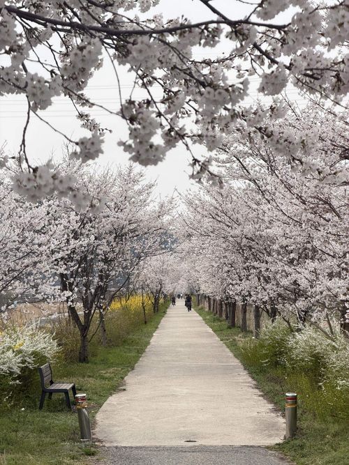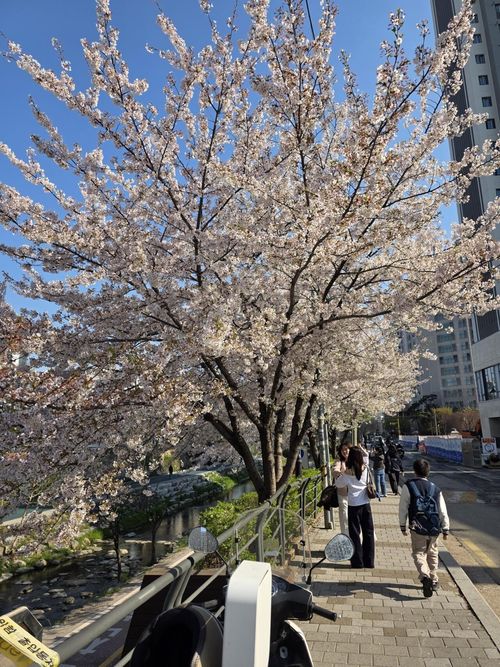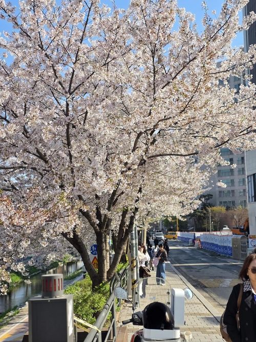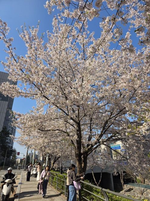 커다란 벚꽃 나무가 마치 지붕처럼 산책로를 덮고 있었습니다. 파란 하늘과 하얀 꽃송이들이 어우러진 모습이 어찌나 예쁘던지, 걷는 내내 카메라 셔터를 멈출 수 없었네요.