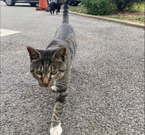 일하다가 잠깐 밖에 나왔는데, 어디선가 회색 줄무늬 고양이가 성큼성큼 걸어오더라고요. 한쪽 앞발이 하얀 양말 신은 것처럼 보여서 더 눈에 띄었어요.