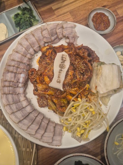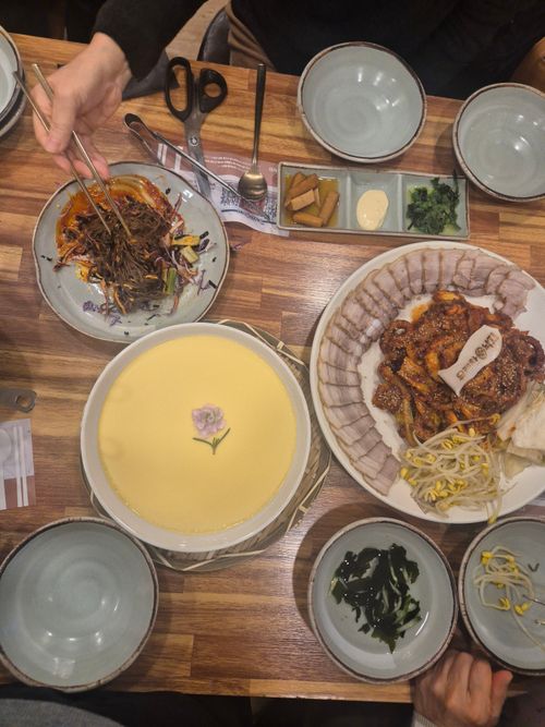 유쾌한 낙지는 돼지수육이랑 낙지볶음이 유명해요 수육이랑 낙지 반반을 시켜 이것저것 다 맛보아요 수육을 먹다가 느끼하다고 느끼면 매콤한 낚지볶음을 먹고 또 맵다고 생각이 들때는 유괘한 낙지의 시그니처라 불리는 계란 찜을 먹어요 계란찜은 마치 푸딩같이 찰랑거려요 너무좋아요 마지막으로 태화강국가정원이 옆이다 보니 십리국수라 이름붙은 이아이는 새콤달콤하여 식사하기전에 먼저 먹는 식전요리입니다 모임장소로 좋은것 같으니 한번 와 보세요