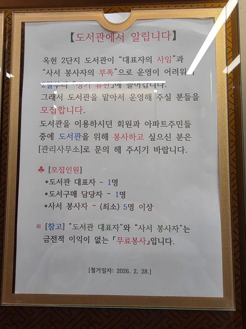 금전적인 이득이 없는 봉사자들로 구성되어 운영 해왔나 보더라구요. 사실 시간내서 도서관 사서를 자청해서 한다는게 쉽지만은 않은것 같은데 그동안 운영을 계속 해왔다는 것도 신기합니다^^ 지금 두달째 벽보가 게시중인데 봉사자 구하기가 쉽지 않은 모양입니다. 뭔가 새로운 대책이 필요해보이는데 여러분들 생각이나 다른 아파트들은 어떻게 운영중인지 궁금하네요.